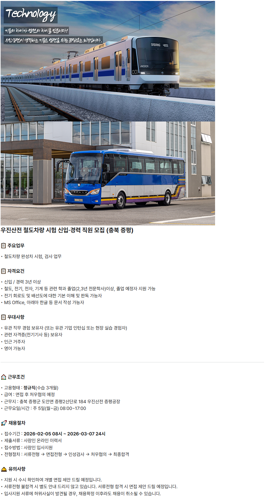 회사소개 사업분야 연구개발 홍보관 인재채용 사회공헌 KOR ENG CEO인사말 경영이념 비전 및 핵심가치 인증서 연혁 사업장 안내 철도차량 전기버스 스마트 에너지 연구소 소개 연구개발 실적 영상 카다로그 공지사항 인재상 복리후생 채용안내 채용공고