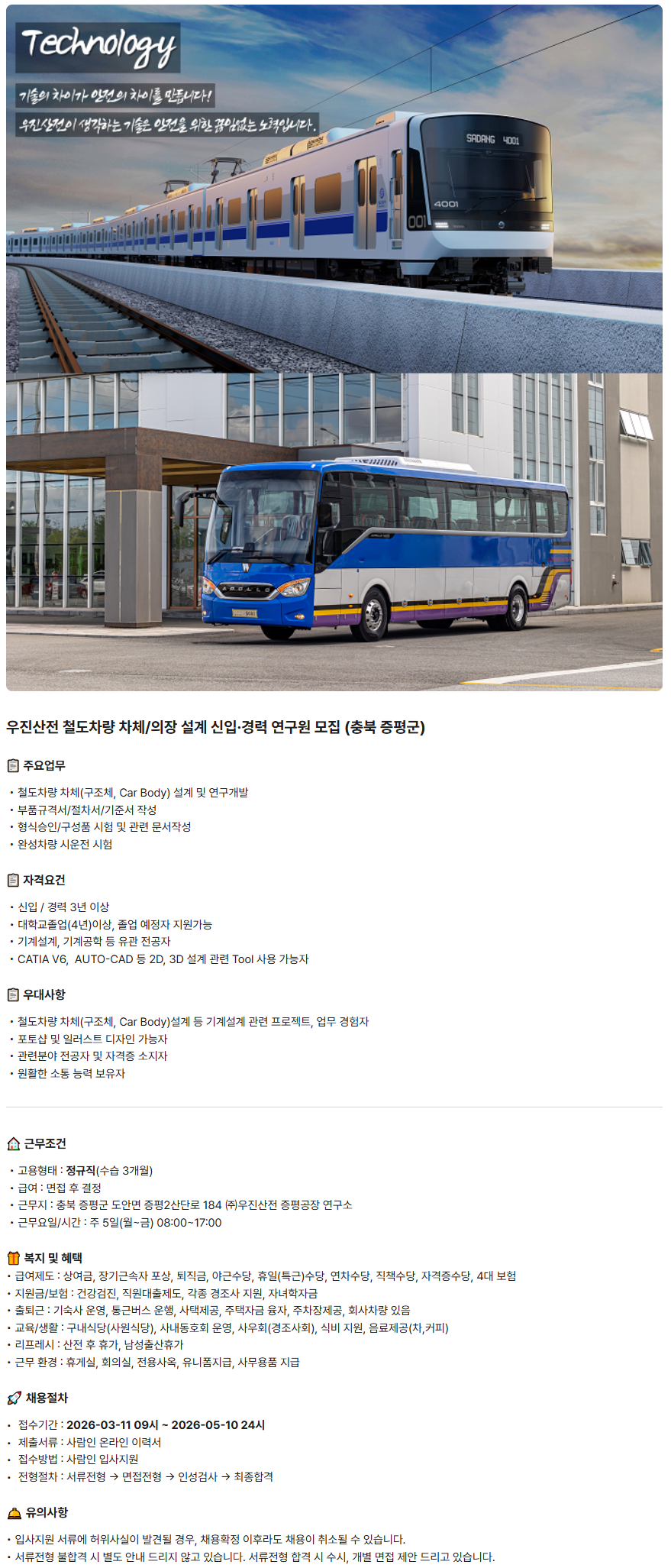 회사소개 사업분야 연구개발 홍보관 인재채용 사회공헌 KOR ENG CEO인사말 경영이념 비전 및 핵심가치 인증서 연혁 사업장 안내 철도차량 전기버스 스마트 에너지 연구소 소개 연구개발 실적 영상 카다로그 공지사항 인재상 복리후생 채용안내 채용공고